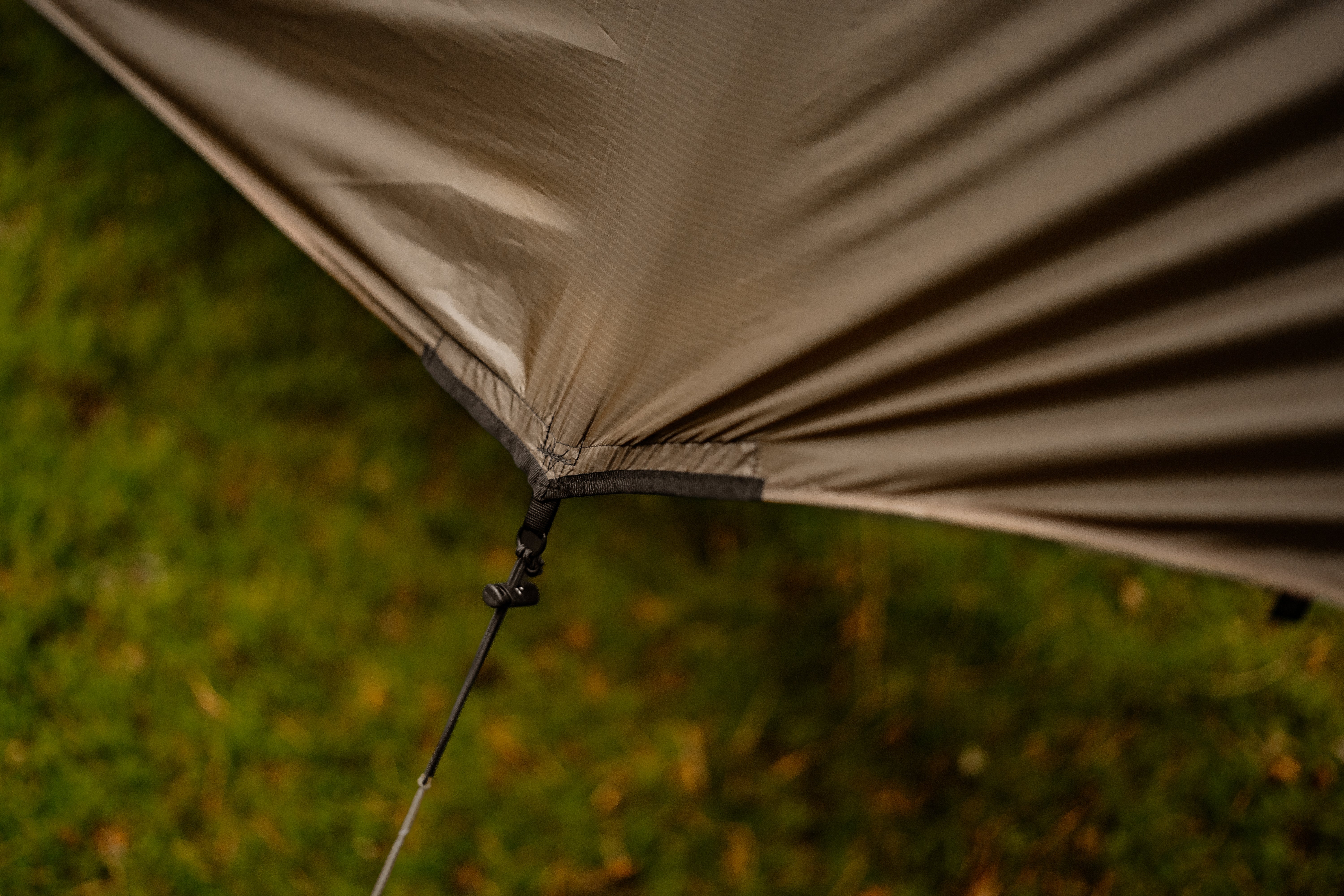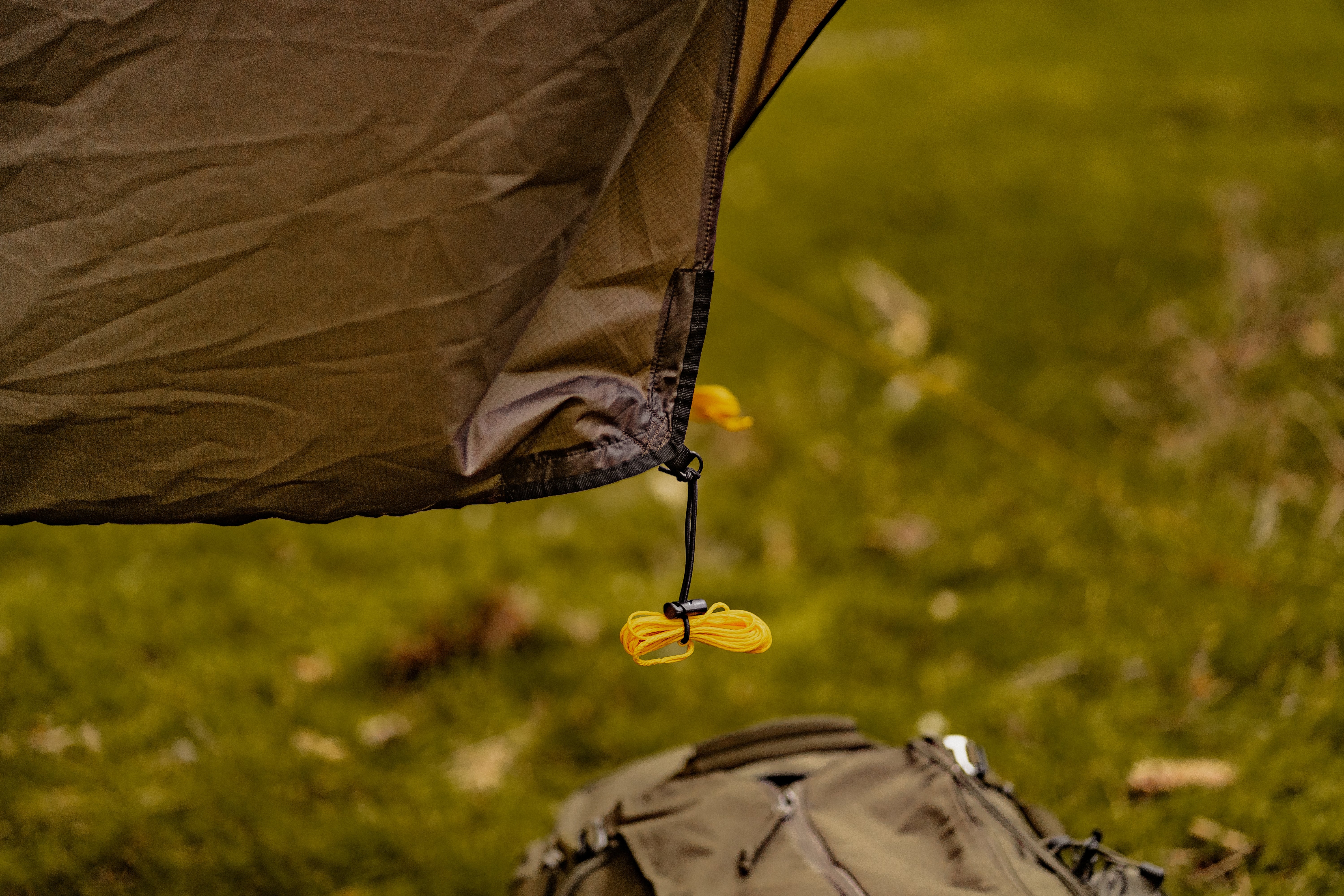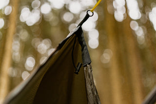 Alle sechs Abspannpunkte sind sorgfältig verstärkt, gesäumt und zusätzlich mit kleinen, leichten Metallringen versehen. Das erhöht die Langlebigkeit, ohne Gewicht oder Handling zu beeinträchtigen. Für ein stets straffes Setup ist jeder Abspannpunkt mit einem Shock Cord ausgestattet – so bleibt dein Tarp auch bei Wind und Regen perfekt gespannt.